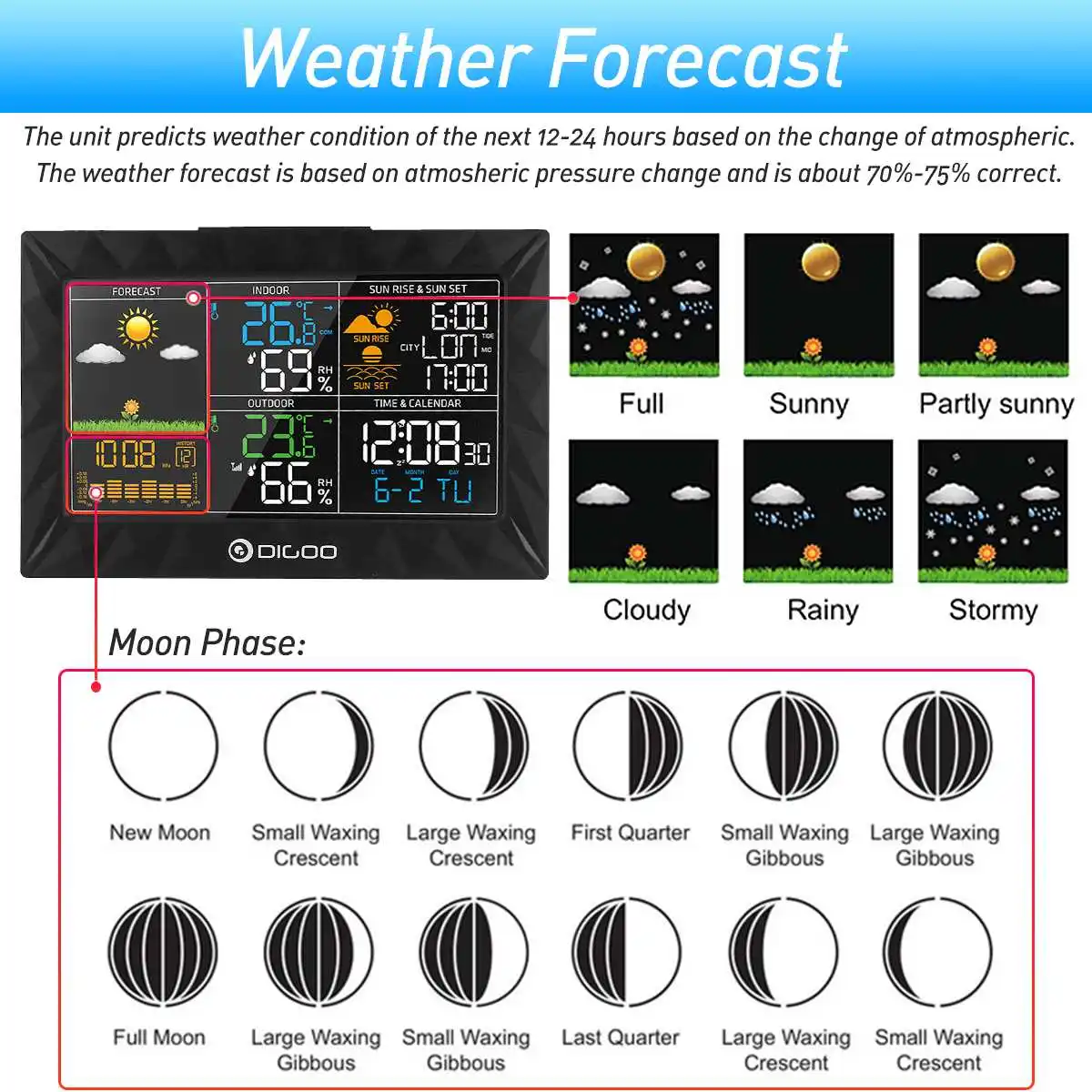 Метеостанция DIGOO DG-TH8988 с ЖК-дисплеем, комнатный и Уличный Термометр, барометр влажности, будильник, календарь для восхода и заката