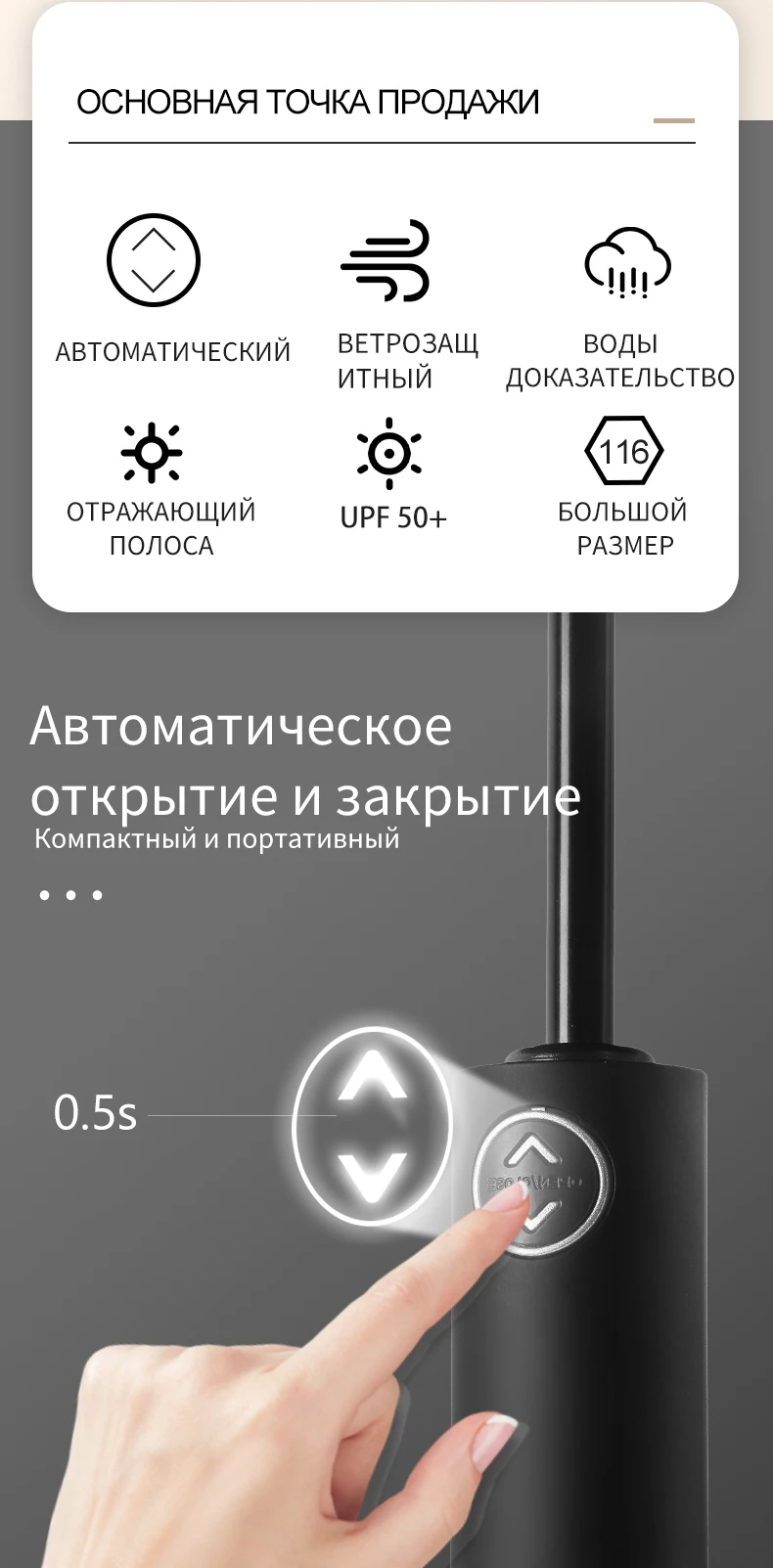 4. Быстро развернуть/свернуть: путем добавления в ребрышки высокой Натяжной пружины, наш зонт открывается и закрывается гораздо быстрее и гладче, чем обычный зонт, так что вы можете оставаться сухим и элегантным!