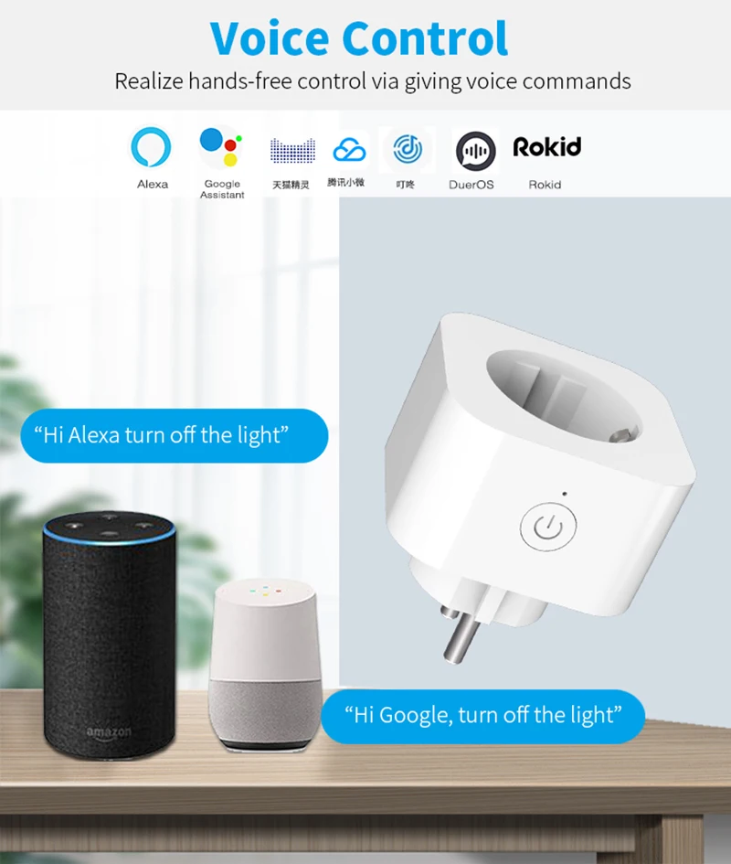 Эта умная вилка позволяет Голосовое управление с помощью Alexa/Google. Простая и быстрая работа путем сканирования qr-кода для загрузки приложения (app Store /Google play Store)