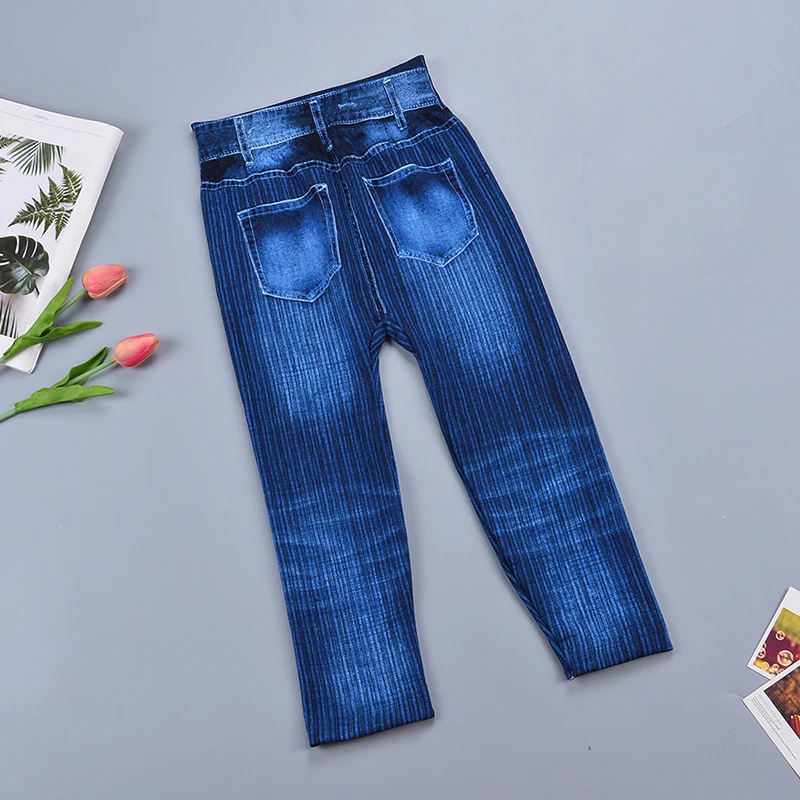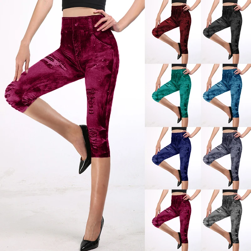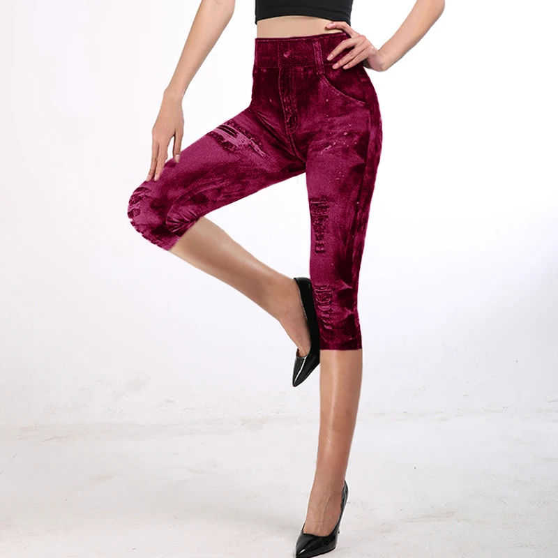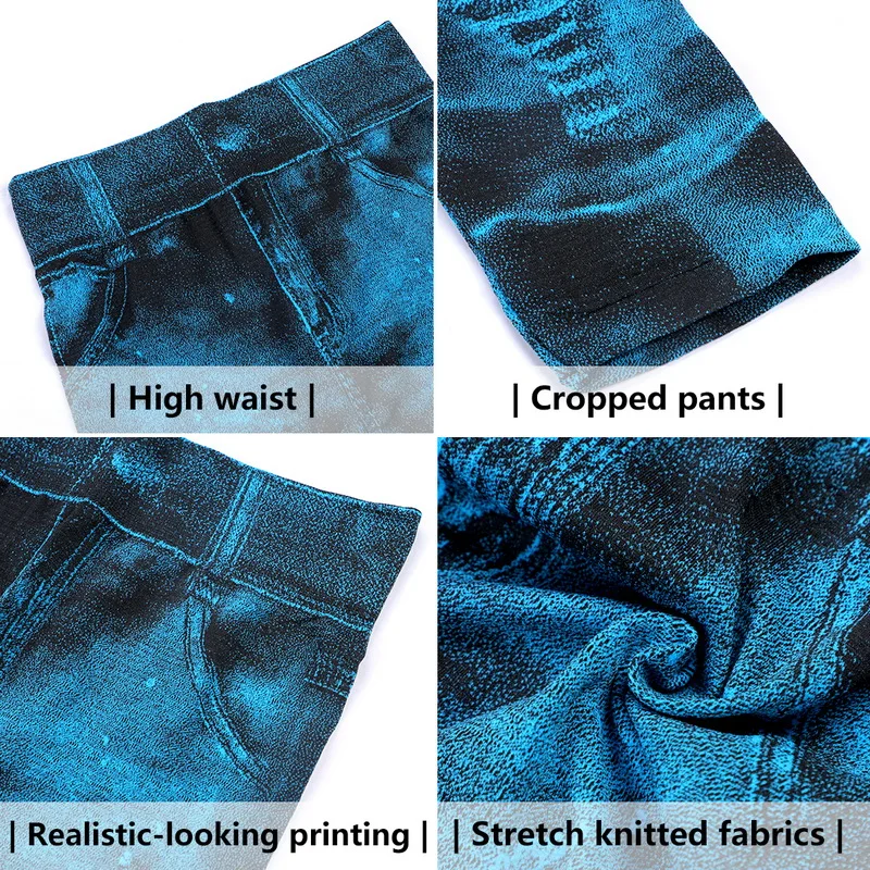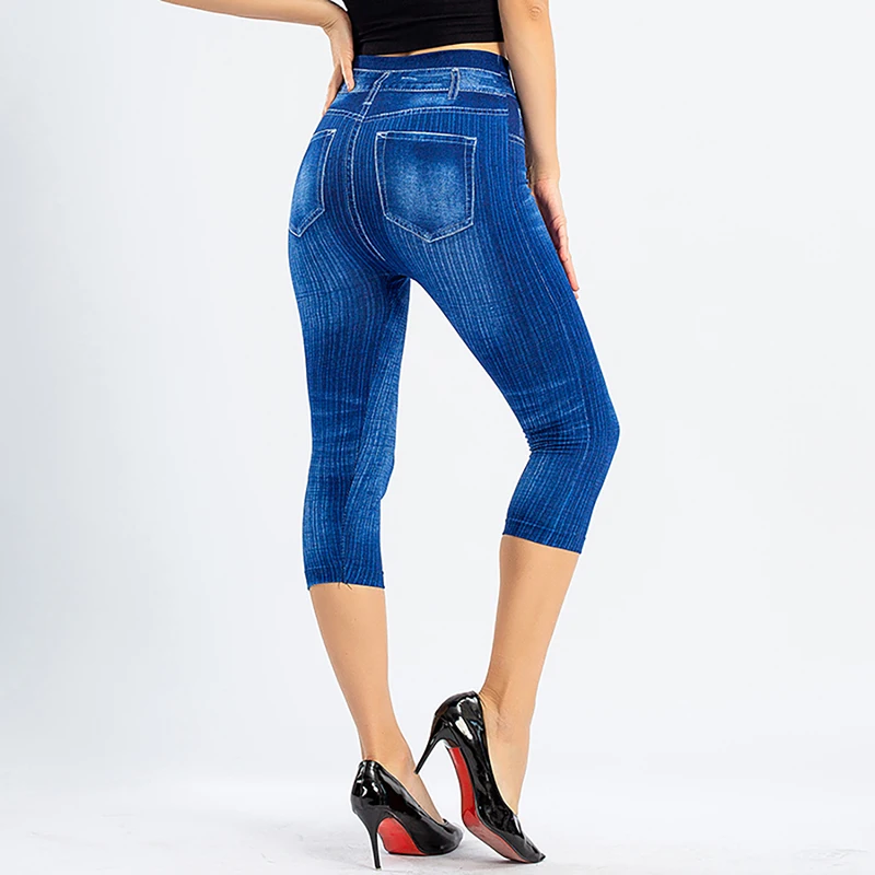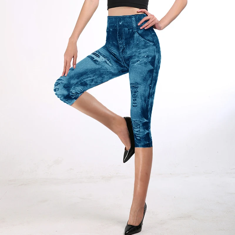 Новинка 2020, имитация джинсов, штаны для йоги, леггинсы, летние штаны 3/4, женские Капри с высокой талией, Стрейчевые джинсовые леггинсы с принтом