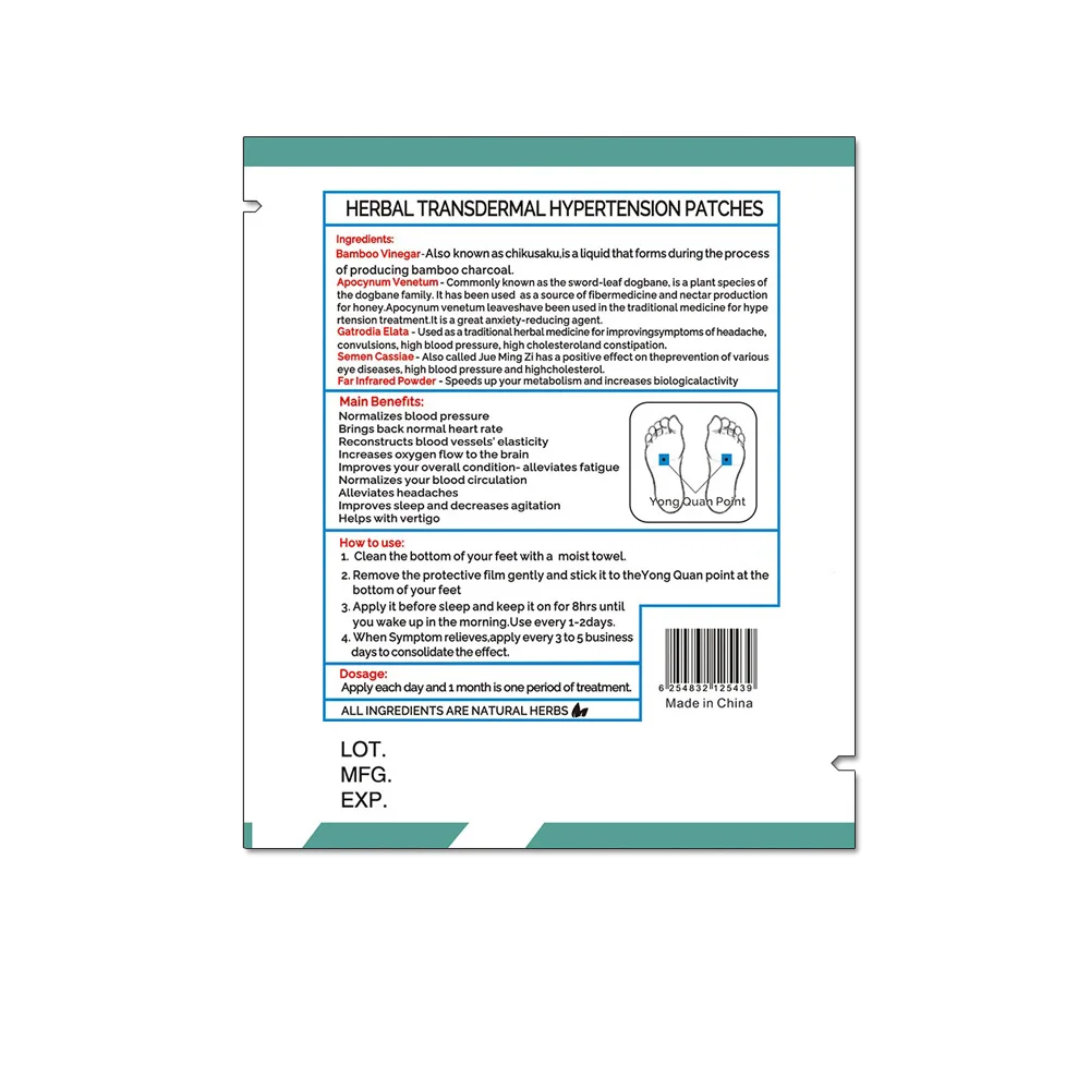 Пластырь содержит специальные травяные сапонин, очищенные от концентрации трав и функции, которые эффективно регулируют выход сердца. Он может расширить кровеносные сосуды, уменьшить сопротивление снаружи, чтобы замедлить сердцебиение до нормальной частоты. Уменьшая внешнее сопротивление в начальный период и уменьшая сердечный выход позже, это может уменьшить высокое кровяное давление и успокоить дух одновременно.