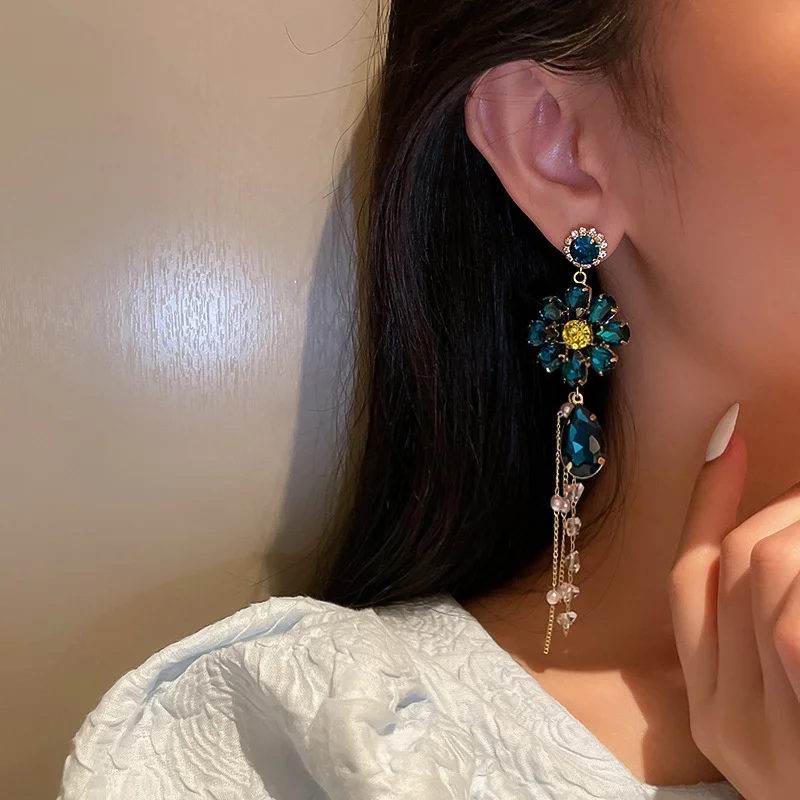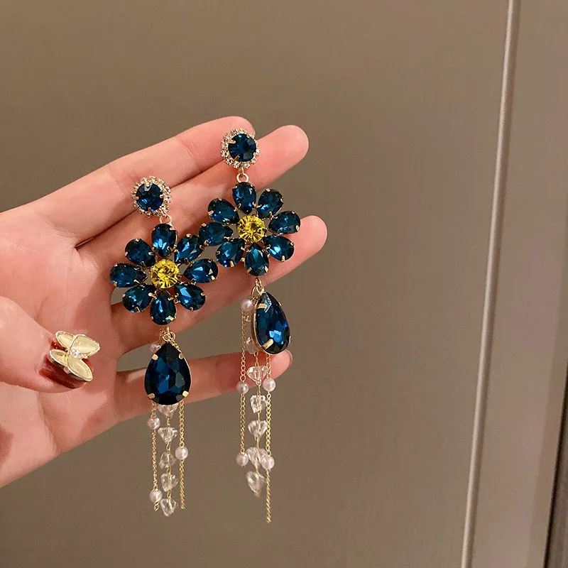 FYUAN летние фиолетовые синие висячие серьги в Корейском стиле с цветами для женщин длинные висячие серьги с кисточками и кристаллами в виде капли воды ювелирные изделия