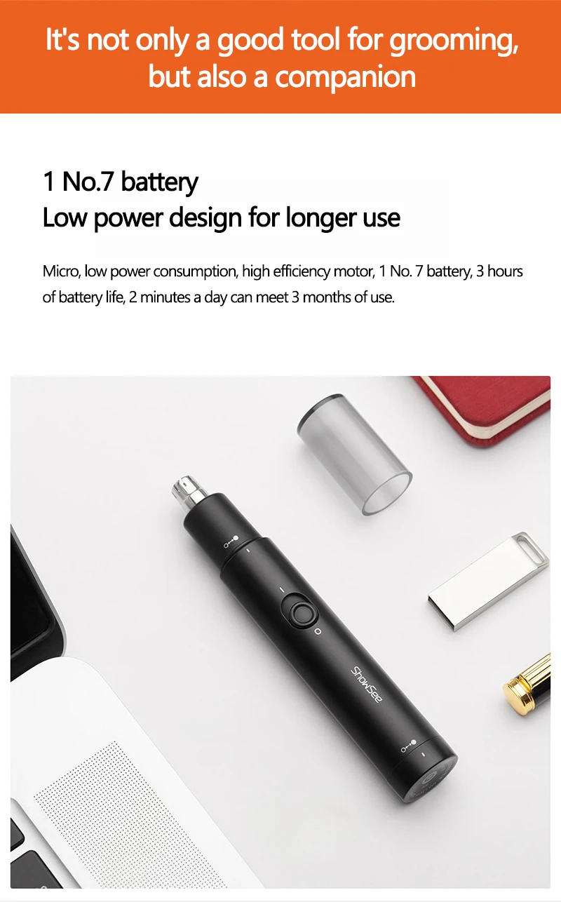 Название продукта: Showsee маленький подходящий триммер для волос в носу Модель продукта: C1-BK Номинальное напряжение: DC1.5V Номинальный ток: 1A Номинальная мощность: 2 Вт Вес нетто: 26,1 г (без батареи) 37,3 г (с батареей) размер изделия: длина 114 мм диаметр 19 мм Исполнительный стандарт: GB4706.1-2005 GB4706.9-2008