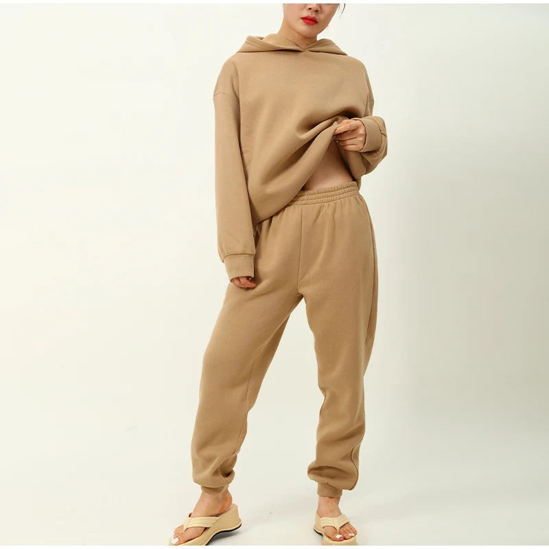 Женский однотонный Костюм-двойка, теплый свитшот с капюшоном и длинные брюки, спортивный костюм большого размера, 2021