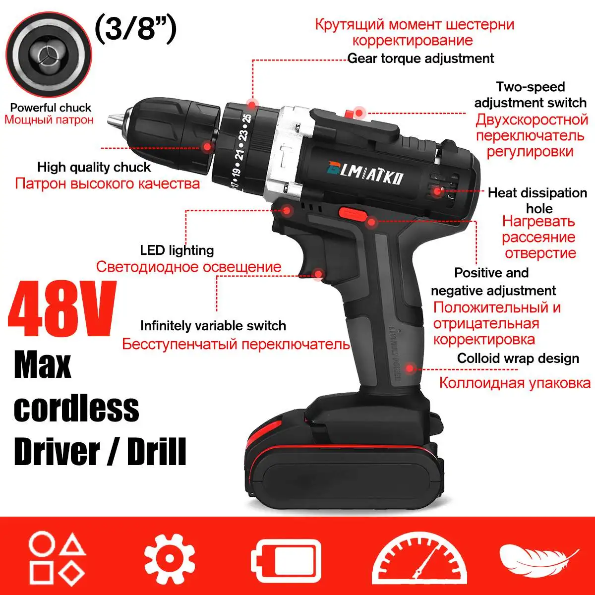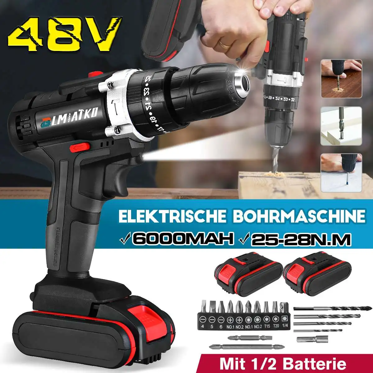 Электродрель и отвертка BLMIATKO 48 в 3 в 1, 2 скорости, 25 + 3 турских инструмента, Аккумулятор 6000 мАч, аксессуары для дрели