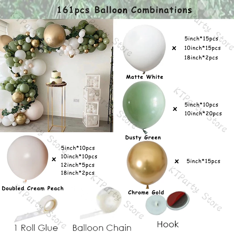 161Шт (16 футов) воздушный шар Упаковочный лист:Пыльно-зеленый (5 дюймов * 35 шт., 10 дюймов * 30 шт.)Матовый белый (5 дюймов * 35 шт., 10 дюймов * 30 шт., 18 дюймов * 3 шт.)Хромовое золото (5 дюймов * 15 шт., 10 дюймов * 5 шт., 18 дюймов * 2 шт.)Крем-персик в два раза (5 дюймов * 5 шт., 18 дюймов * 1 шт.)Бесплатно: рулонный клей * 1(100 шт)Воздушная цепь * 1(5 м)Крючок * 3
