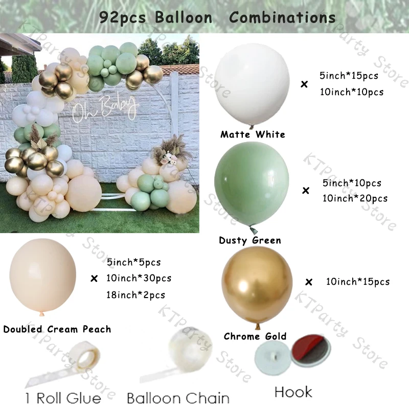 92Шт (9 футов) воздушный шар Упаковочный лист:Пыльно-зеленый (5 дюймов * 5 шт., 10 дюймов * 20 шт.)Матовый белый (5 дюймов * 5 шт., 10 дюймов * 10 шт.)Кремовый персик (5 дюймов * 5 шт., 10 дюймов * 30 шт., 18 дюймов * 2 шт.)Хромовое золото (10 дюймов * 15 шт.)Бесплатно: рулонный клей * 1(100 шт)Воздушная цепь * 1(5 м)Крючок * 3