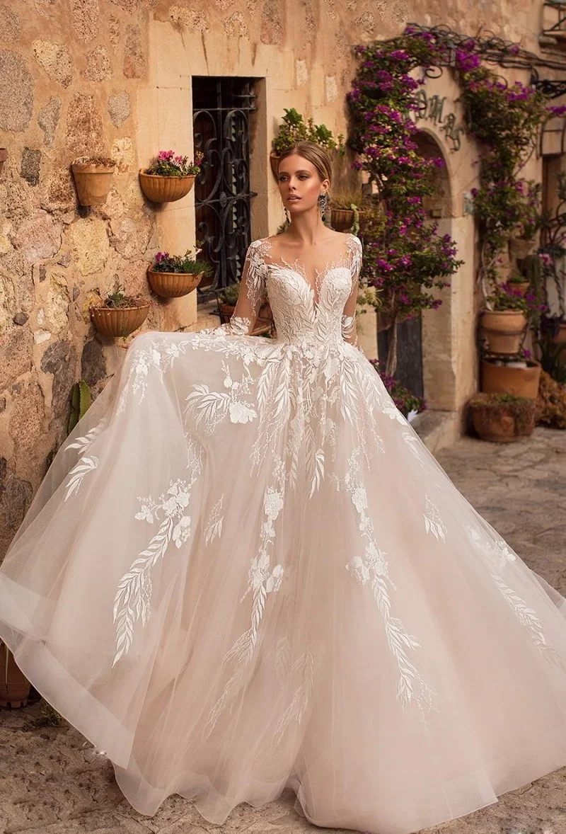 Кружевное свадебное платье Naviblue, с вырезом, длинными рукавами, на лето, 2021