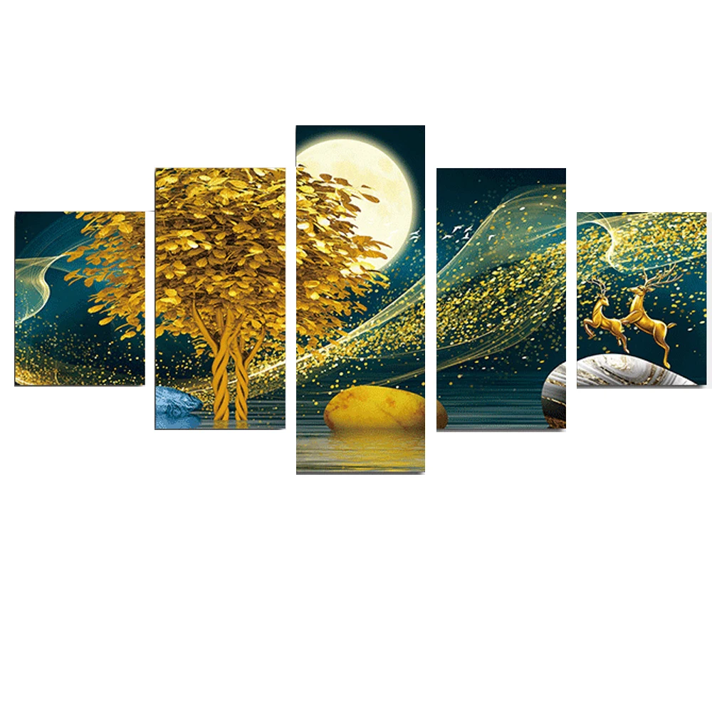 Без рамки 5 шт. Золотой дерево олень Луна холст для живописи отпеча...