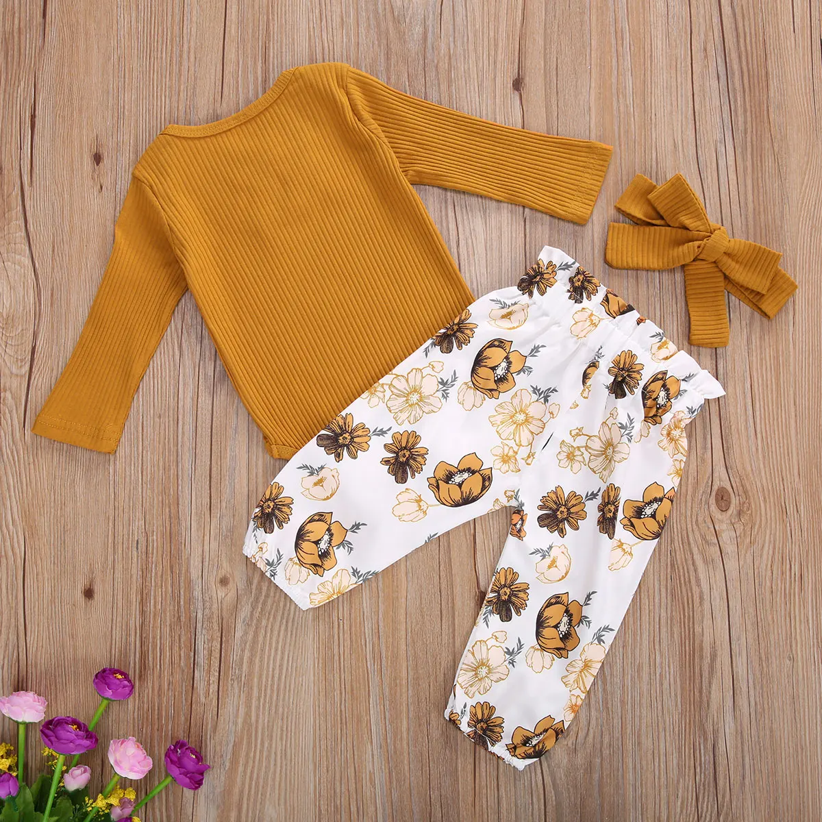 Комплект одежды для новорожденных девочек, однотонное вязаное боди с длинным рукавом, топы, Цветочные штаны, повязка на голову, 3 шт., наряды, повседневная одежда для младенцев