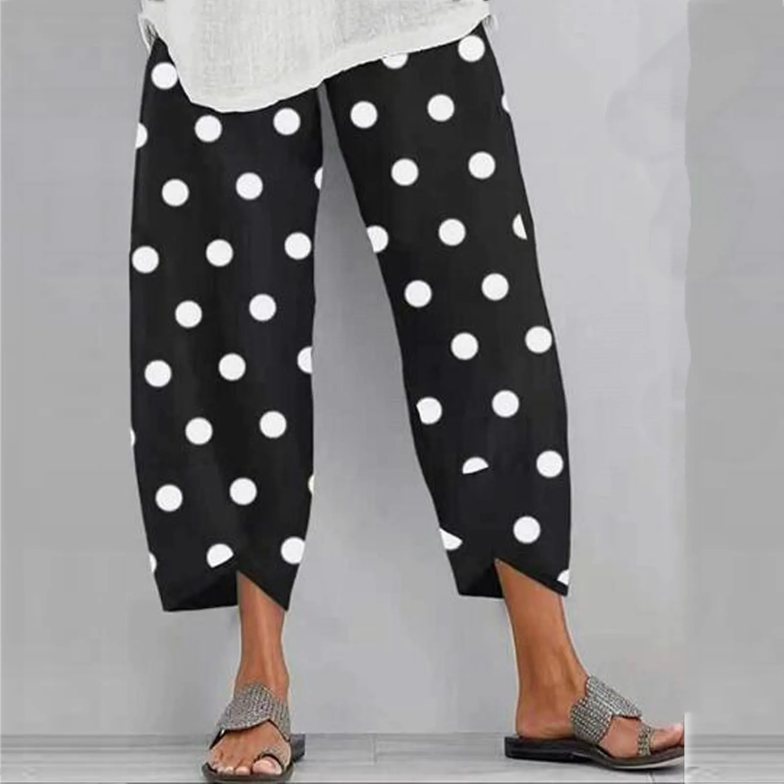 Штаны женские в горошек, из эластичного хлопка и льна, с геометрическим принтом, с карманами