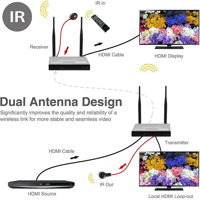 Абсолютно новый и высококачественный, покупайте с уверенностью Usb-порт предназначен только для usb-мыши или клавиатуры, не может использоваться для других устройств Этот беспроводной адаптер HDMI предоставит вам возможность беспроводной передачи аудио и видео высокой четкости, Который может удаленно передавать аудио и видео HDMI на дисплеи высокой четкости, такие как телевизор/ Проектор/дисплей. Этот продукт принимает стандартный протокол беспроводной передачи, который имеет быструю скорость передачи И сильная способность анти-помех. TX поддерживает локальную петлю HDMI; Он также поддерживает инфракрасный пульт дистанционного управления для Расширенные приложения, подходят для конференций, тренировок, образования, домашних развлечений и других приложений. 1. Этот продукт поддерживает до 200 метров без передачи препятствий; До 164 футов (50 м) через стену (Пожалуйста, обратите внимание, что расстояние, количество препятствий, Матиры, толщина и т. д. все это влияет на использование эффекта, если используется через препятствия, эффект использования зависит от В реальной ситуации. Потому что это зависит от многих факторов, если это возможно, мы советуем вам использовать его в открытом пространстве). 2. Передатчик поддерживает локальную петлю HDMI, чтобы облегчить мониторинг источника видео. 3. Поддержка разрешения to1920x1080P @ 60 Гц. Совместимость с различными устройствами HDMI 4. Принимает Международный 2,4 ГГц/5 ГГц двухчастотныйБеспроводная связьСигнал передачи, быстрая скорость передачи и Сильная способность анти-помех. 5.Максимальное входное/выходное расстояние HDMI: менее 5 метров, разрешение 1920X1080P @ 60 Гц Посылка (для 1 комплекта): Передатчик HDMI TX * 1 HDMI приемник RX * 1 Двухдиапазонная Антенна 2,4G/5G * 4 12 В постоянного тока адаптер питания * 2 ИК-кабель * 2 Руководство по эксплуатации * 1