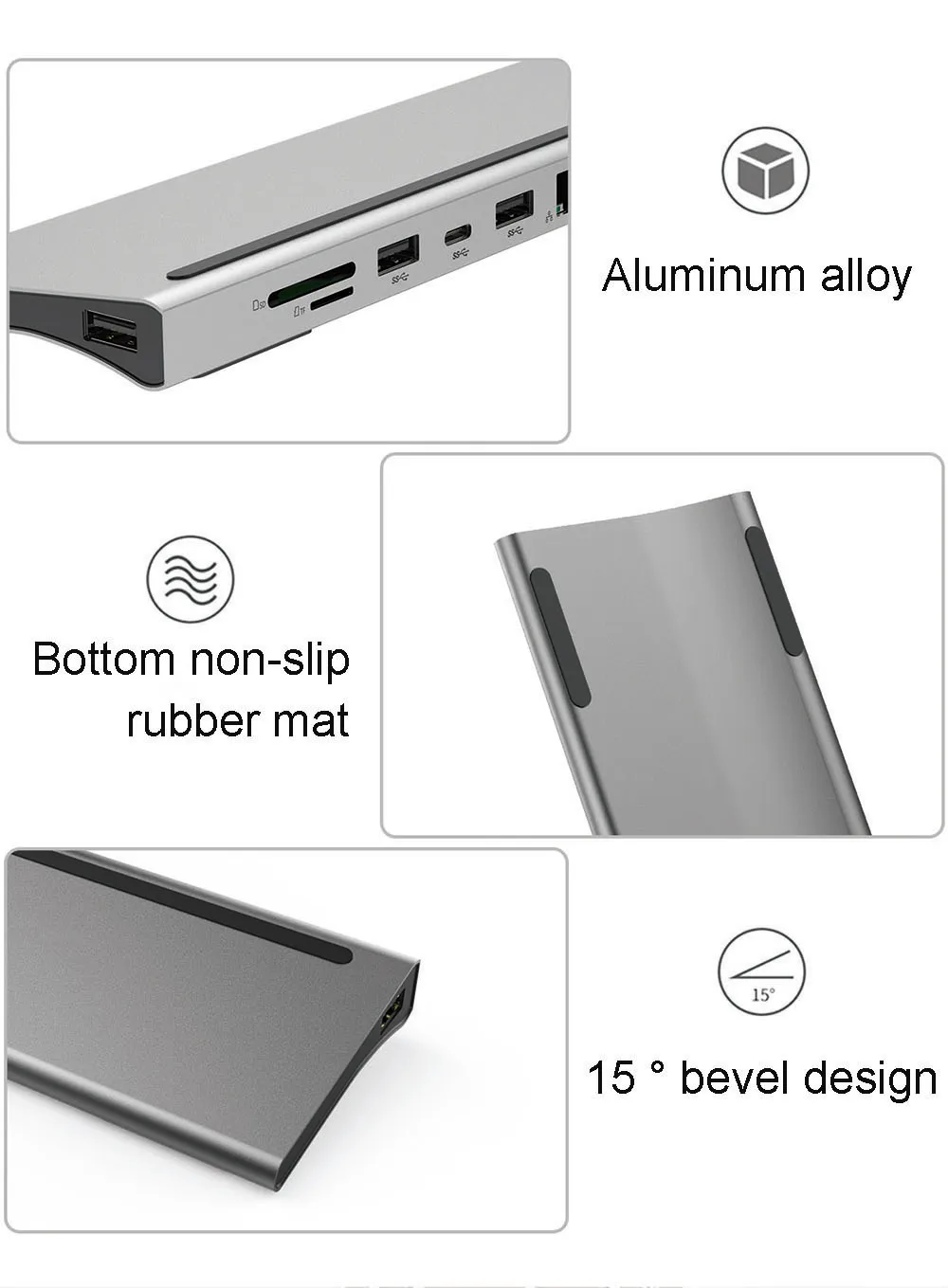 Характеристики:Материал: алюминиевый сплавЦвет: серебристый/серыйРабочая температура: 40-45 °Интерфейс:> Разъем USB 3,1 Type-C> USB 3,1 Type-C порт для зарядки> Только порт передачи данных USB C> Порт USB 3.0 Type-A> Выходной порт HDMI