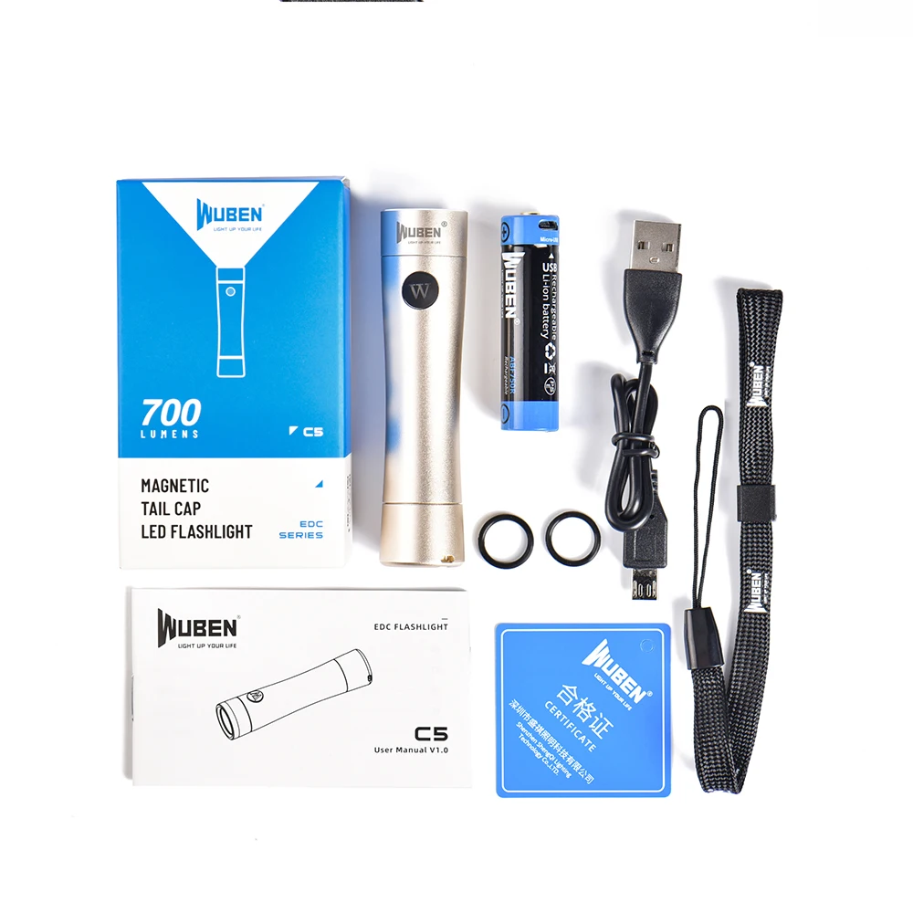 【Мини светодиодный фонарик, легко переносимый 】 фонарик WUBEN C5 EDC с батареей весит 57 граммов, легкий, как яйцо, отлично подходит для ежедневного или наружного использования. Он использует OSRAM P9 светодиодный и Жесткий анодированный 6061 авиационный алюминиевый сплав, максимальный выход до 700 люменов, максимальное расстояние луча до 126 метров. 【 6 режимов светодиодный фонарик и удобная мощность 】 4 основных режима (высокий, средний, низкий, лунный) и 2 режима вспышки (стробоскоп, SOS). Боковой переключатель, один переключатель, все функции, легко и удобно. Он питается от 3,7 V USB Перезаряжаемые 14500 Батарея (все указанные аккумуляторы входят в комплект поставки) или 1,5 V AA Батарея. Он может длиться около 70 часов дольше в режиме Луны. Подходит для домашнего использования, ухода за садом, прогулок с животными, Походов, Кемпинга и т. д. 【Мягкий и удобный светильник, светильник-вспышка с кремниевым диффузором 】светильник-вспышка WUBEN C5 поставляется с силиконовым диффузором, который maks светильник-мягкий и удобный прожектор-светильник. Кроме того, магнитный задний колпачок этого мини-фонарь позволяет его прикрепить к Железному материалу, чтобы освободить руки. Водонепроницаемость IP65. Фонарь изготовлен из алюминиевого сплава, имеет магнитную заднюю крышку, прочный, этот светодиодный фонарь имеет защиту от пыли и воды ip65. Упаковка включает: Фонарик 1xc5 1x литий-ионный аккумулятор 14500 1x USB кабель для зарядки 1x Ремешок 2x уплотнительное кольцо 1x диффузор 1x Руководство пользователя