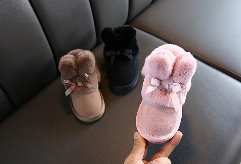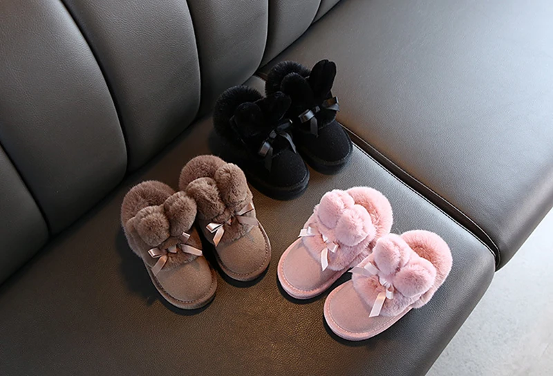 Детские зимние ботинки для девочек; Замшевые зимние ботинки с кроличьими ушками для маленьких девочек; Теплая зимняя обувь на меху для девочек; Нескользящая детская обувь с бантом