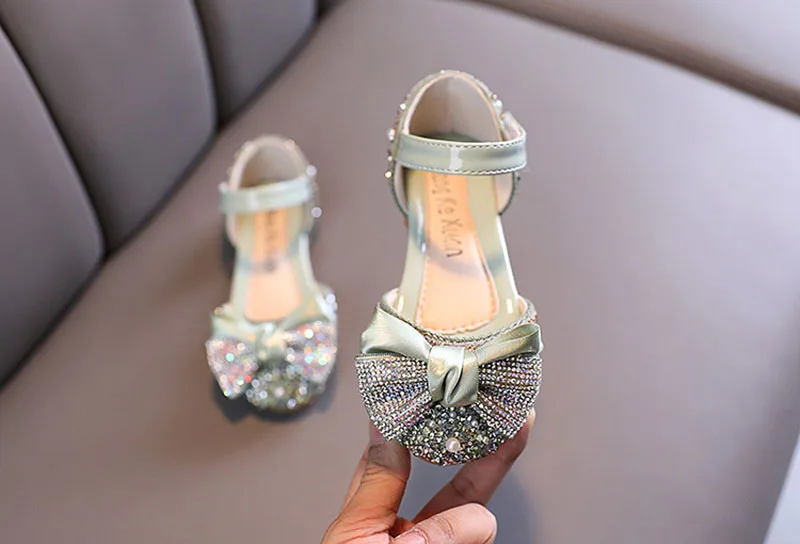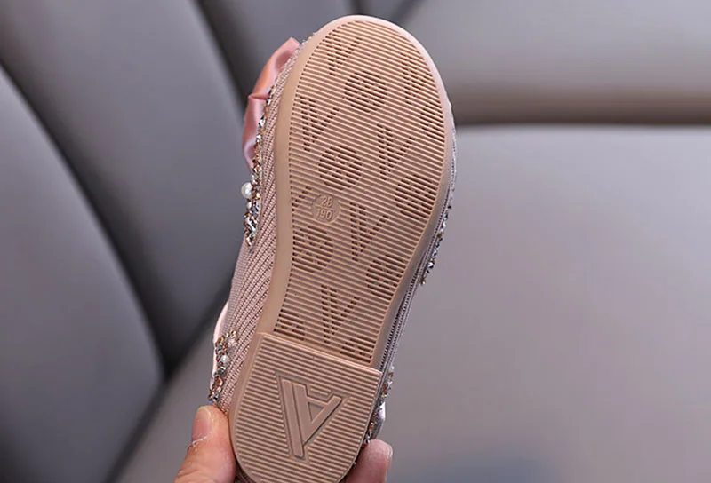 Детские кожаные туфли Стразы с жемчугом, блестящие детские туфли принцессы, обувь для маленьких девочек вечерние ринку и свадьбу, весна-лето