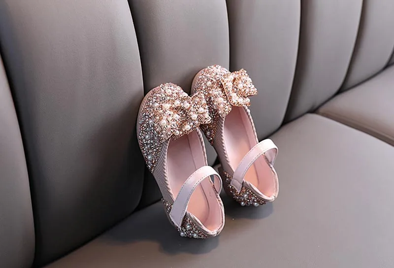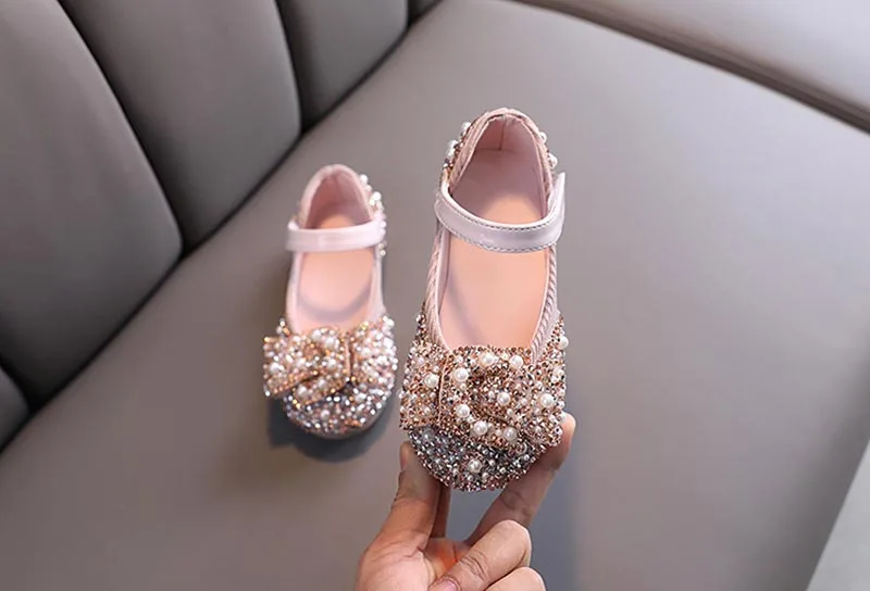 Обувь для девочек; Обувь принцессы; Детские кожаные жемчужные стразы блестящая обувь; Детская обувь с бантом для вечерние и свадебные туфли; Сезон весна-лето