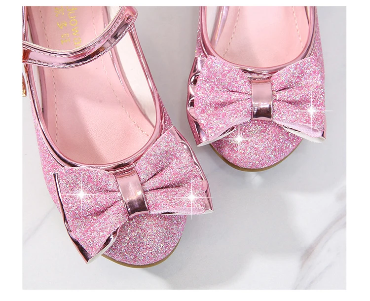 Обувь принцессы для девочек; Блестящая обувь на высоком каблуке с бантиком-бабочкой и стразами; Детская кожаная обувь на мягкой нескользящей подошве; Тонкие туфли