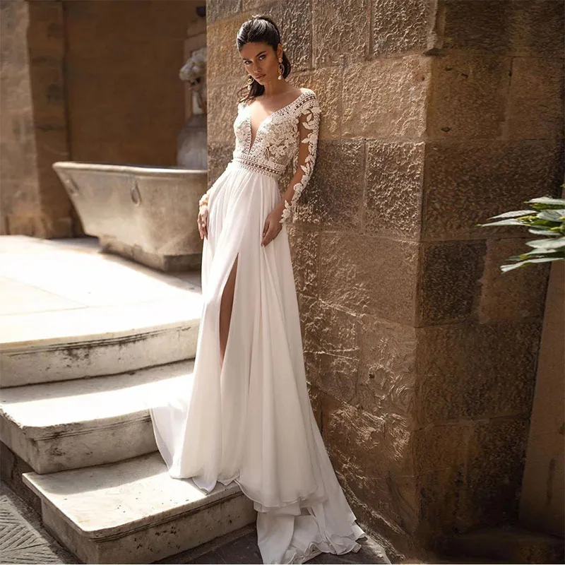 Винтажное сексуальное бохо, свадебные платья, глубокий v-образный вырез, шифон, разрез сбоку, открытая спина, пляжные богемные платья, халат De Mariée, vestido de novia