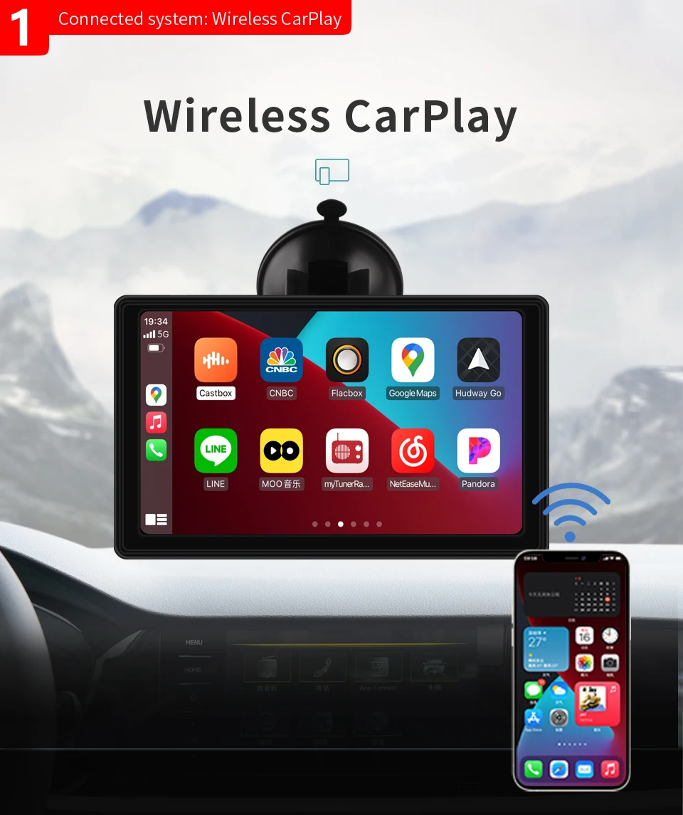 Беспроводная система CarPlay in-car позволяет безопасно оставаться в автомобиле использовать iPhone для синхронизации мобильных приложений в фокусе Синхронизируйте навигационные приложения вашего телефона во время вождения, музыкальное программное обеспечение, делая телефонные звонки, siri voice, отправка и получение сообщений и т. Д. Вы просто подключите свой iPhone и играйте.
