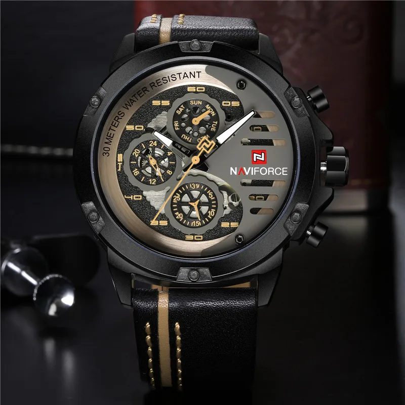 Часы наручные NAVIFORCE Мужские кварцевые, спортивные брендовые Роскошные армейские деловые, в стиле милитари, с отображением даты и недели, с ремешком из натуральной кожи, 9110
