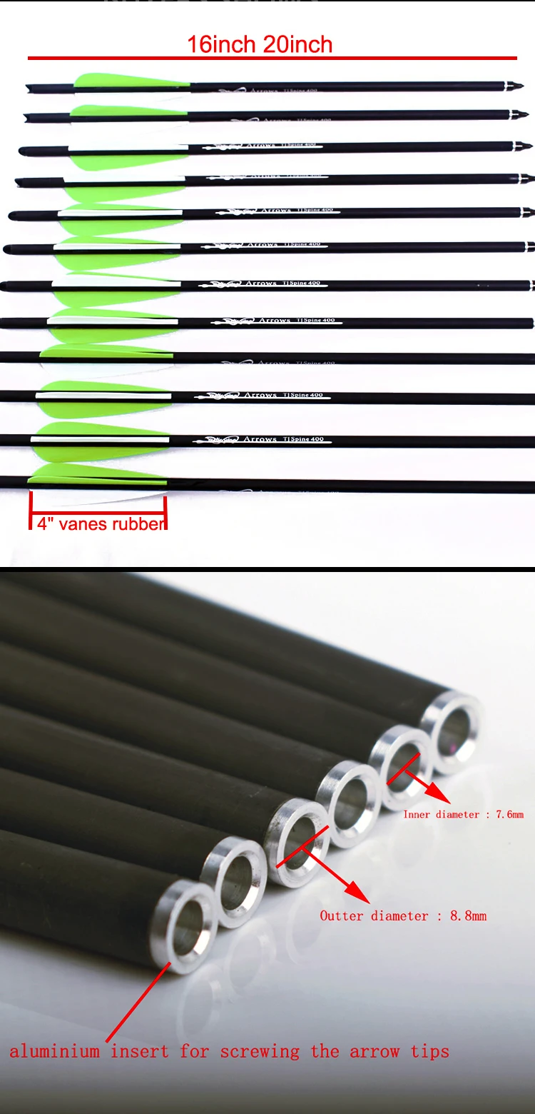 Карбоновые стрелы 6 шт., 1620 дюйма, болты для арбалета зеленого и белого цвета, 4 дюйма, резиновые лопасти для стрельбы из лука и охоты