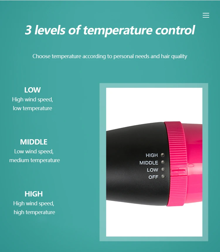Количество передач: 3 шестерниТемпература выхода воздуха: 120 °Функция: рулон и прямое двойное использованиеПрименимые волосы: влажные и сухие двойного использованияМощность: 3 в 1 режим: 1000 Вт/2 в 1 режим: 25 Вт-35 ВтДлина шнура питания: 2 м, может поворачиваться на 360 градусовСтандарт штепсельной вилки: стандарт ЕС, стандарт США, стандарт Великобритании и стандарт Австралии (пожалуйста, выберите в соответствии с вашим собственным местоположением)