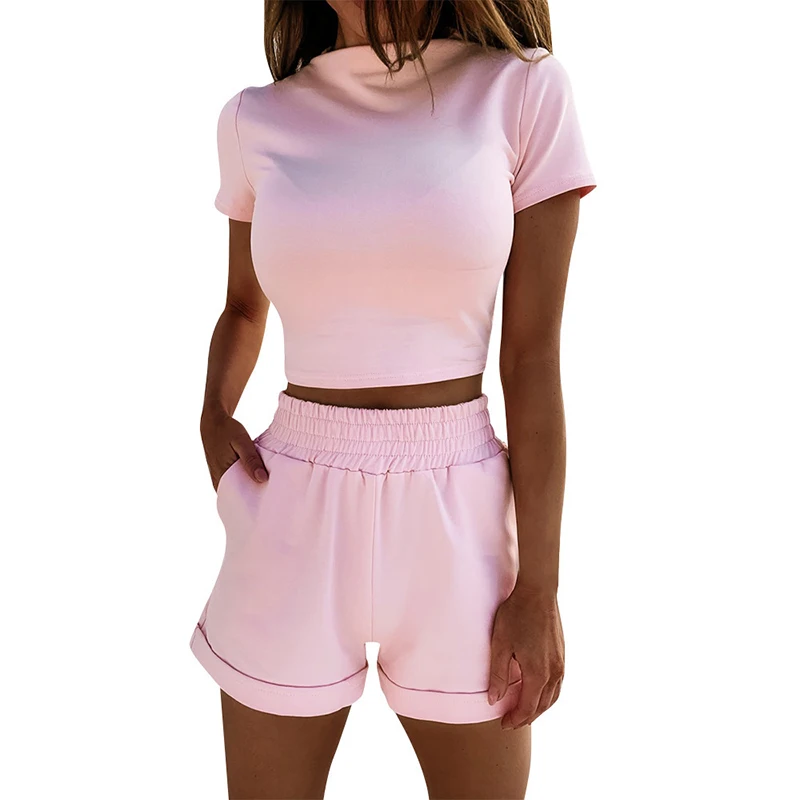 Женский комплект из 2 предметов, однотонный короткий топ и шорты, Летняя Сексуальная футболка с коротким рукавом, короткие брюки, Спортивная повседневная одежда