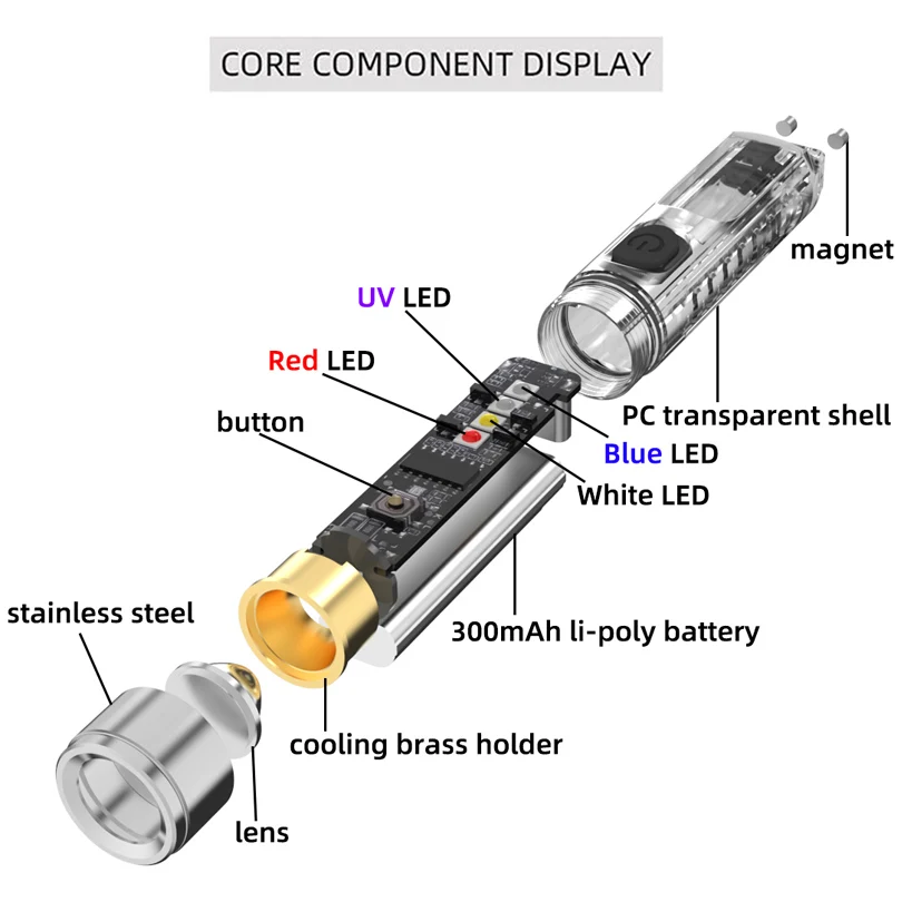 Посылка включает:1 мини-фонарик1 usb-кабель Type-C1 х кольцо для ключей1 x Подарочная коробка