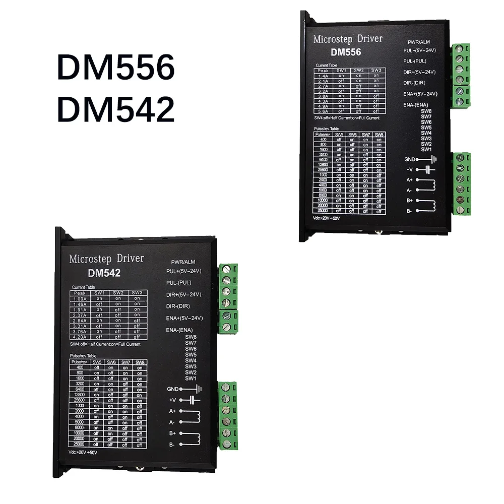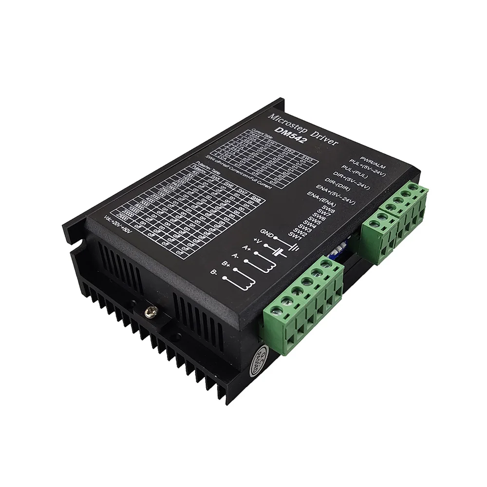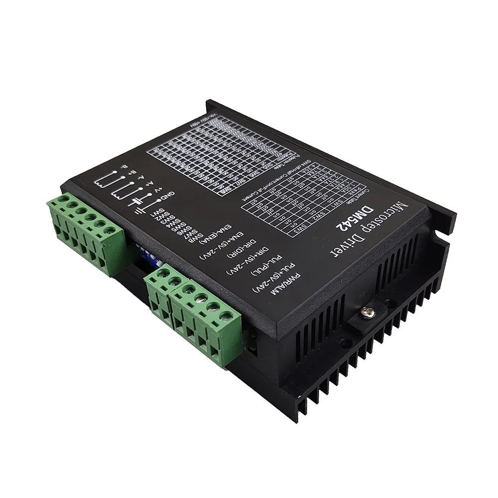 Цифровой Драйвер DM542/DM556 DSP питается от постоянного тока 24-50 в и подходит для двухфазного гибридного шагового двигателя s с двухфазным гибридным шаговым двигателем 42-57-86 и током менее 4,2 А. Текущий цикл серводвигателя переменного тока используется для управления подразделением, который имеет сильную защиту от помех, стабильную работу оборудования, отсутствие потери шага, низкий крутящий момент колебания двигателя и высокая точность позиционирования.