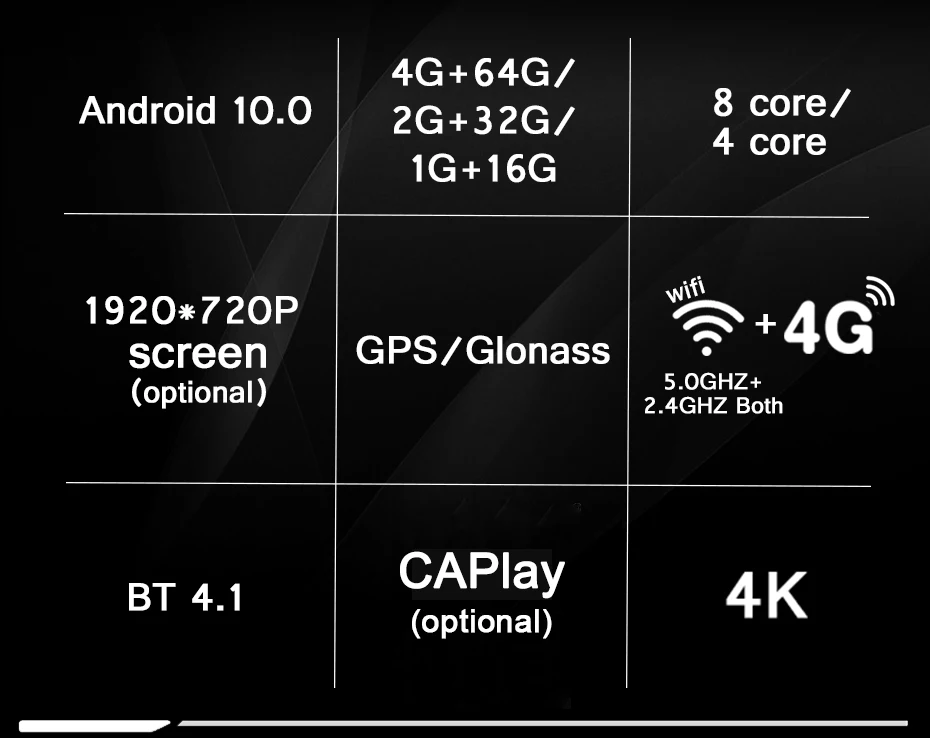 1. Android 10.0 RAM(4G / 2G) ROM(64G / 32G) Восьмиядерный/четырехъядерный IPS HD емкостной сенсорный экран.2. Подарок = карта + дополнительный микрофон (Файл карты будет установлен на радио, карта не включена)3. BT4.14. Поддержка воспроизведения видео 4K Ultra HD, H.264 (AVC), H.265 (HEVC)5. 1 + 16G четырехъядерный 1024*6002 + 32G четырехъядерный 1280*4804 + 64G Восьмиядерный 1280*4804 + 64G Восьмиядерный 1920*720P6. Четырехъядерный процессор: MSM 8917 SNAPDRAGON 425Восьмиядерный процессор: MSM 8953 SNAPDRAGON 6257. Экран A-nti-g-lare опционально.8. Это радио поддерживает carplay (опционально)9. Этот продукт совместим с сохранением всех особенностей оригинального автомобильного радио (CD).Поддержка оригинальной аудиосистемыПоддержка оригинальной автомобильной системыПоддержка оригинальной автомобильной камеры или автомобильного радараПоддержка оригинального радио и других