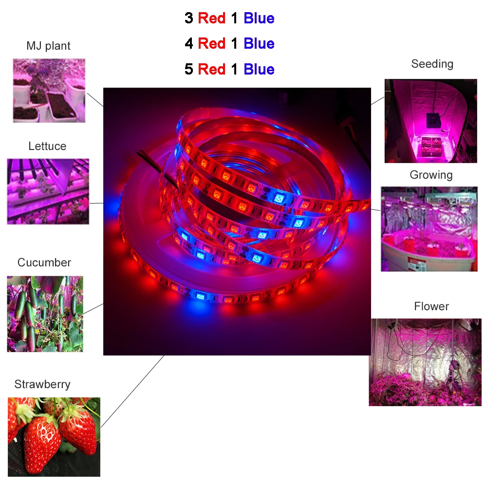 Фитолампа полного спектра, 5 м, 12 В постоянного тока, 60 светодиодовм, SMD 5050