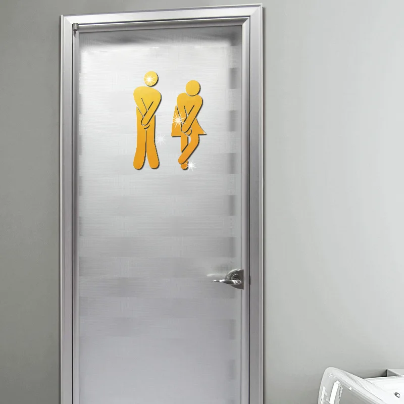 3D знак входа в туалет цвета: золотистый, серебристый Ванная комната зеркала стены Стикеры логотип для торгового центра общественных местах Туалет дверь украшения