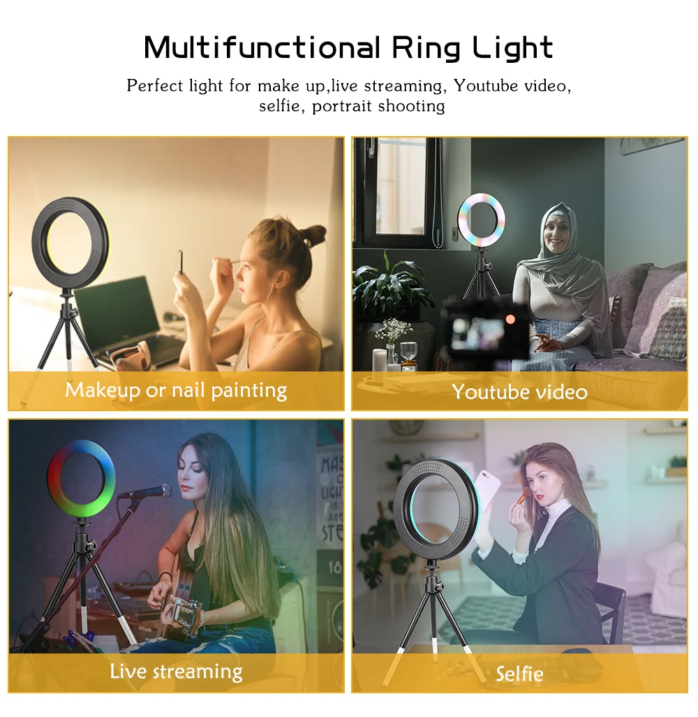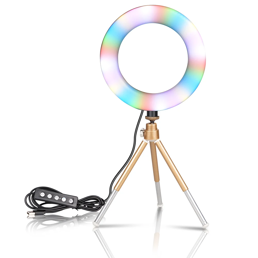 1x6 дюймов RGB светодиодный кольцевой светильник (USB разъем)1x Золотой штатив