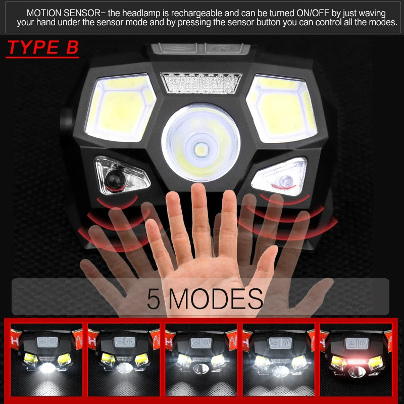 Фонарь налобный Аккумуляторный с датчиком движения и USB-кабелем