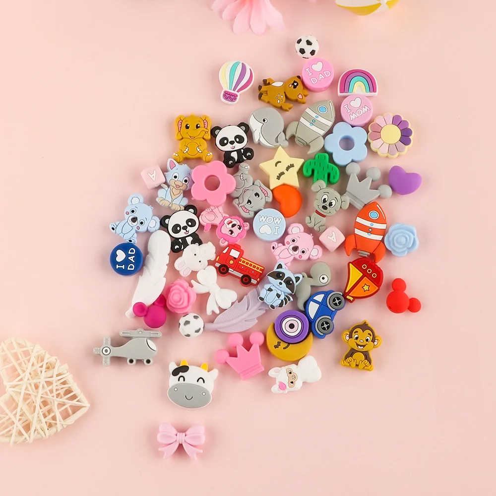 Продукт: различные силиконовые бусины Загрузка: 10 шт смешанных цветов Форма: буква/звезда/цветок/Животные/корона/пожарная машина/ракета и т. Д. Товар: ожерелье/цепочка для соски/браслет/Детские игрушки/деревянный Прорезыватель Функция: прорезывание зубов для детей
