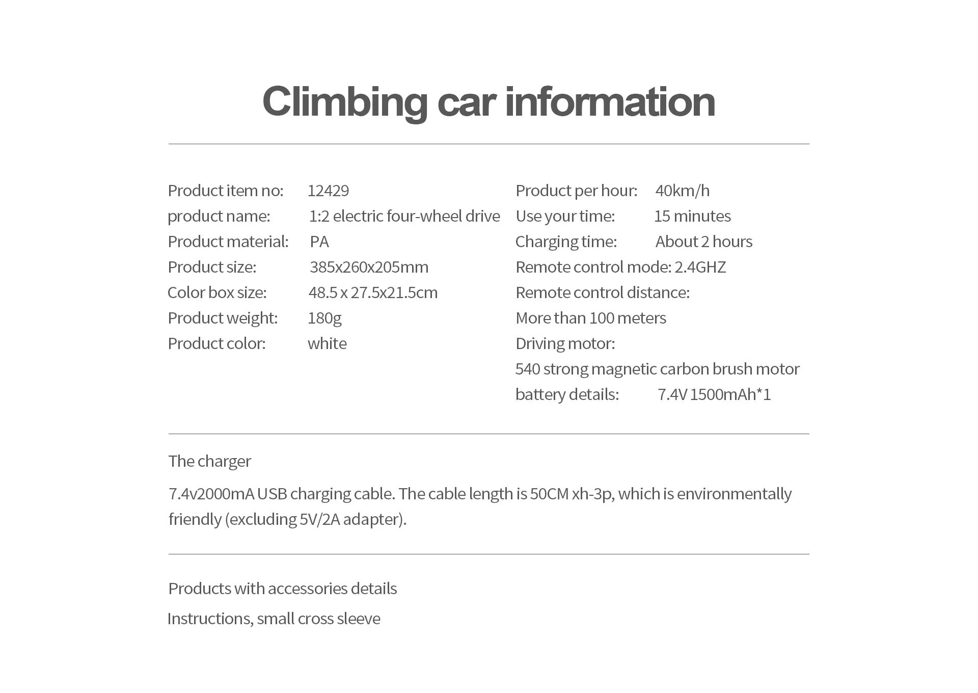 Описание:Категория продукта: Радиоуправляемый автомобильПриводной двигатель: магнит с угольной щеткой 550Частота: 2,4 гДистанция управления: 100 мМодель: 1/12Скорость: 45 км/чВремя зарядки: 3 часаРазмер изделия: 38*27,5*19,5Вес продукта: 1,59 кг (без батареи)Время использования: 8 минутФункция: вперед, назад, влево, вправоАккумулятор Продукта: 7,4 В, 1500 мАч * 1Батарея пульта дистанционного управления: батарея 4XAA (не входит в комплект)Посылка тация:1 * RC автомобиль1 * контроллер1 * аккумуляторная батарея (встроенная)1 зарядное устройство1 * маленький поперечный рукавПримечание: светильник вая съемка и различные дисплеи могут привести к тому, что цвет товара на изображении будет немного отличаться от реального. Допустимая погрешность измерения +/- 1-3 см.