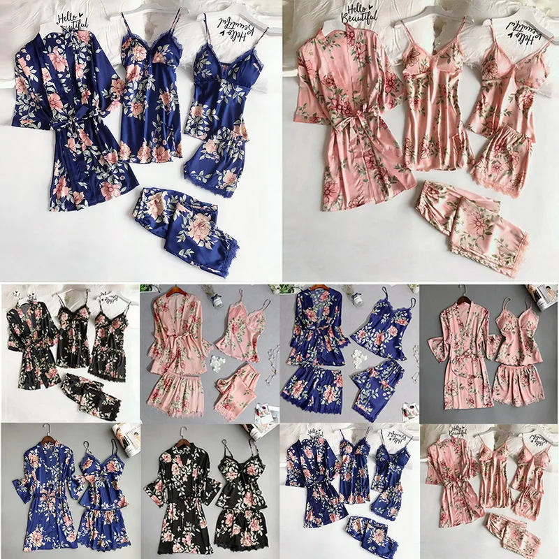 Пижамный комплект женский с кружевной отделкой атласная одежда для сна женская летняя ночная рубашка со штанами Повседневная Домашняя одежда халат-кимоно костюм