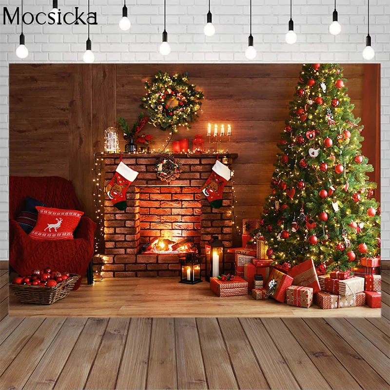 Рождественская елка камин фотография фон деревянный дом комната семейный портрет Декор баннеры фон подарки носок Фотостудия