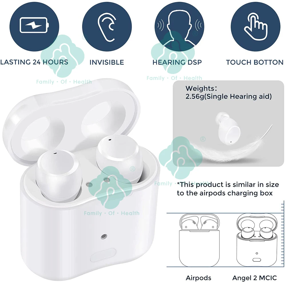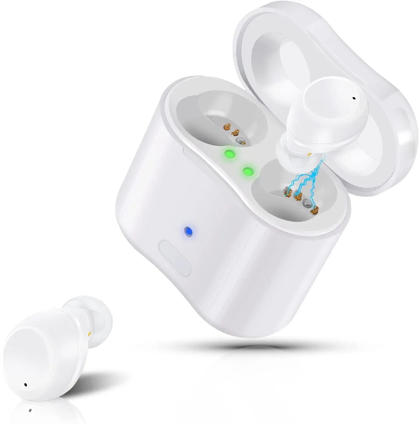 [Самые маленькие слуховые аппараты] Мини-размер: 0,56*0,60*0,74 дюйма, он сидит внутри ушного канала, делает его почти невидимым. Портативная зарядная коробка, которая может заряжаться в любое время и в любом месте и удобна для вашей повседневной жизни.
