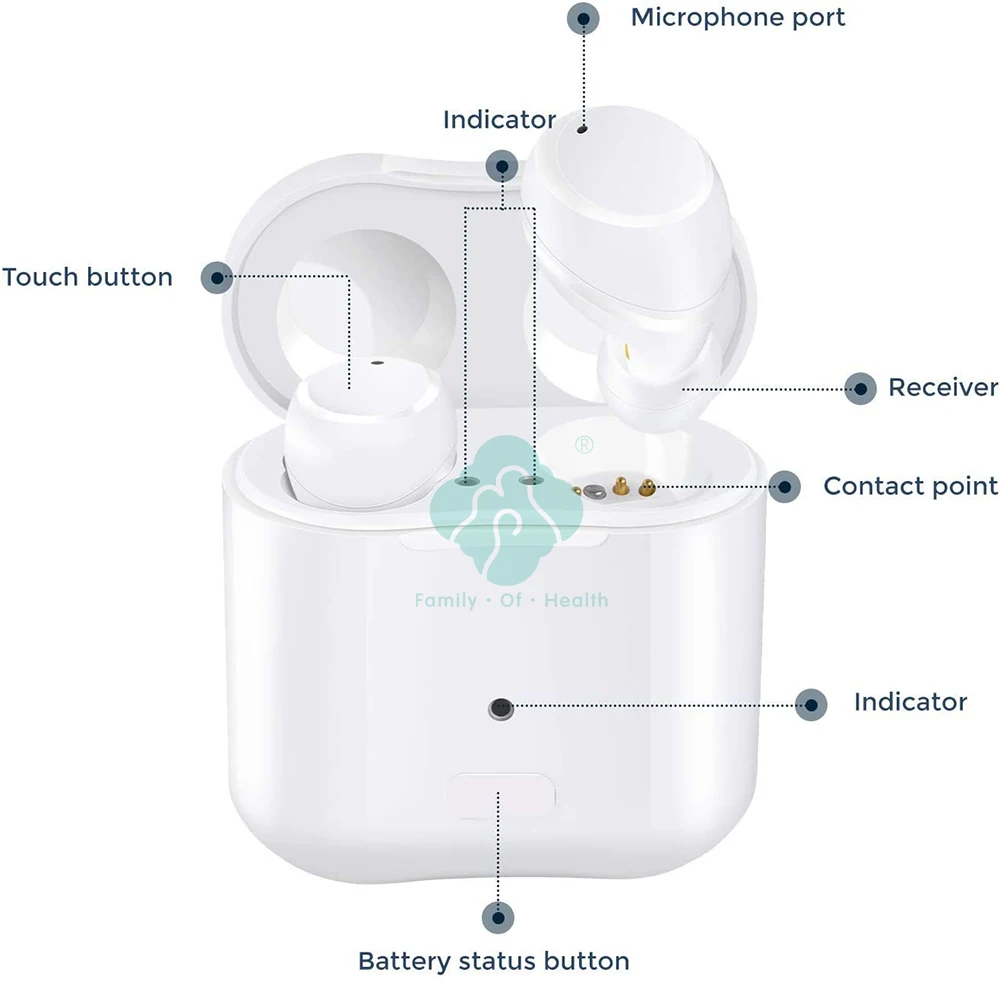 [Прост в использовании] подходит для использования и заряжается. Автоматически включается, когда вы берете слуховые аппараты от зарядного устройства. И 3 программы прослушивания для удовлетворения различных повседневных сцен простым прикосновением к лицевой панели тела слухового аппарата.