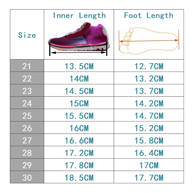 Перед заказом, пожалуйста, Измерьте длину стопы вашего ребенка и выберите правильный размер.1. Пожалуйста, не измеряйте длину стельки, это не длина стопы.2. При измерении длины стопы, пожалуйста, добавьте длину около 0,5 см. Ребенок быстро растет, и мы бы лучше выбрали обувь немного большего размера.3. Выберите правильный размер в соответствии с нашей таблицей размеров.Размер соответствует длине стопы:SIZE21: 12,7 см, SIZE22: 13,2 см, SIZE23: 13,7 см, SIZE24: 14,2 см, SIZE25: 14,7 см,SIZE26: 15,2 см, Size27: 15,8 см, SIZE28: 16,4 см, Size29:17 см, Size30: 17,7 см