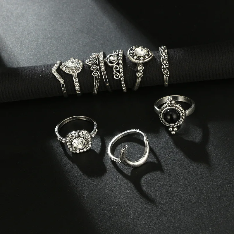 Богемный набор из 10 предметов, Женский винтажный черный набор колец с драгоценным камнем, в виде листа, геометрической формы