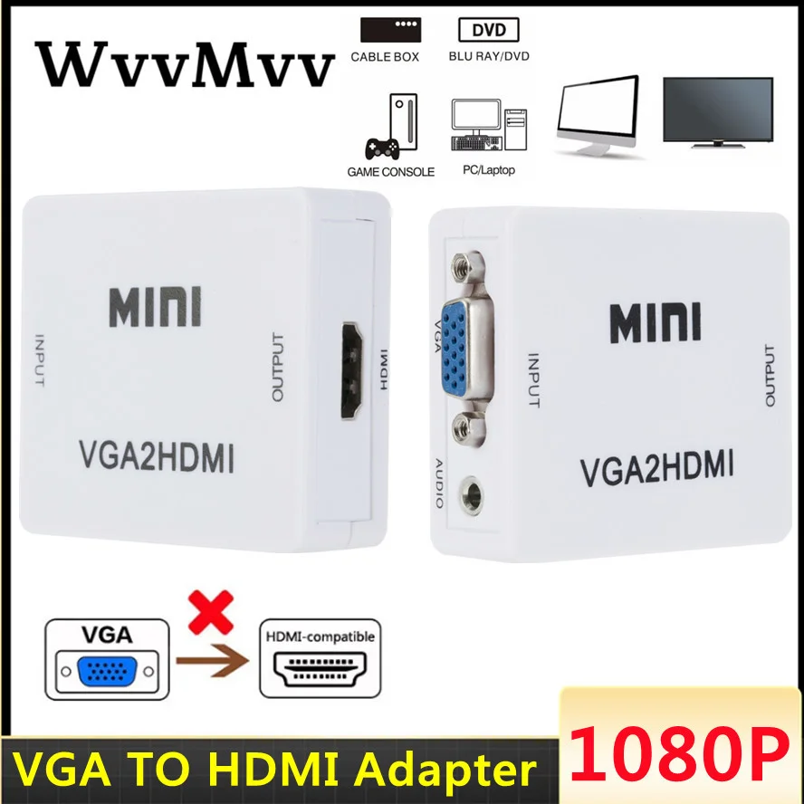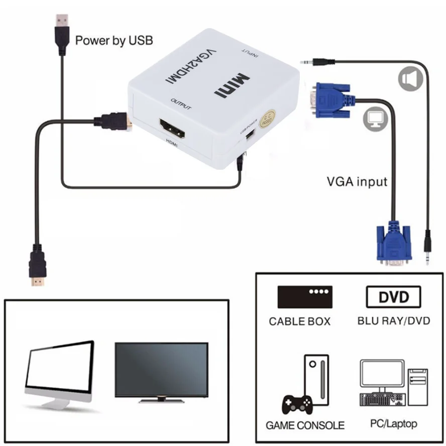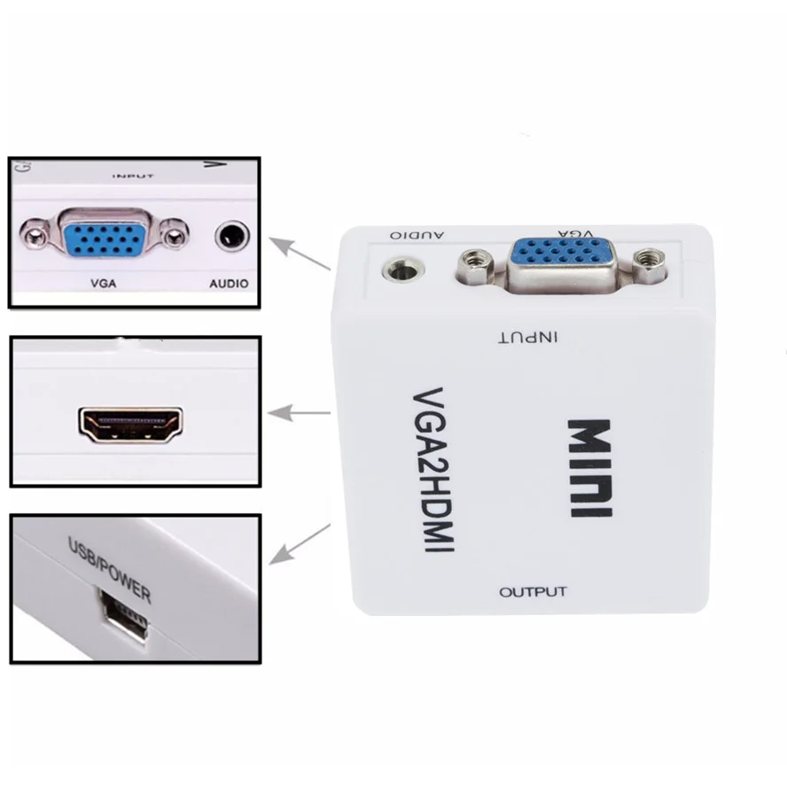 Мини-конвертер VGA-HDMI-совместимый, VGA2HDMI, видео-бокс, аудиоадаптер 1080P для ноутбука, ПК, HD ТВ проектора, ТВ, портативный
