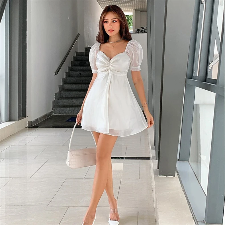 Женский мини-сарафан в Корейском стиле, летнее платье феи из белого тюля в стиле Харадзюку, милая кавайная одежда с пышными короткими рукавами, 2021