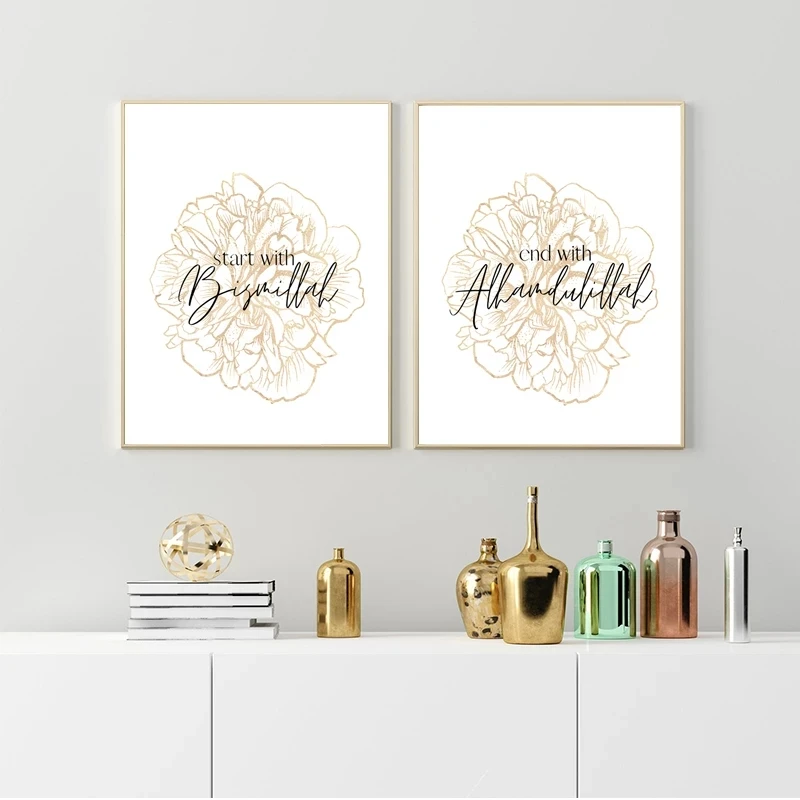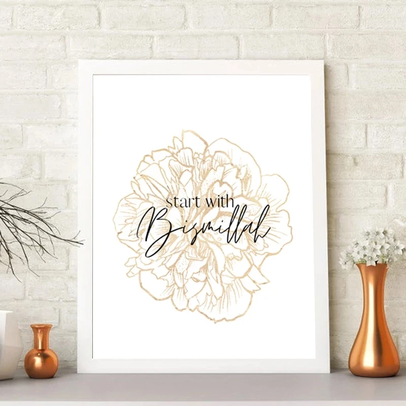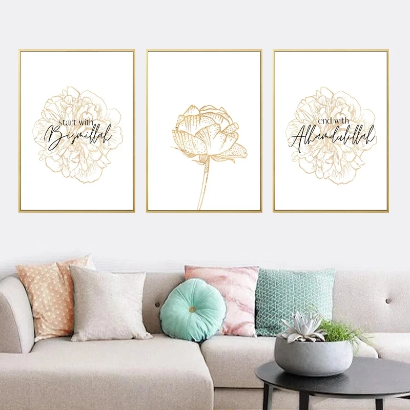 Ismillah исламские цитаты постеры и принты Золотая фольга цветы холст живопись мусульманская стена художественные картины Домашний Декор без рамки