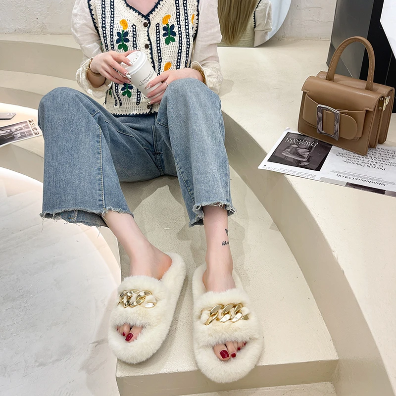 Симпатичные домашние туфли, плюшевые сланцы с металлической цепочко...