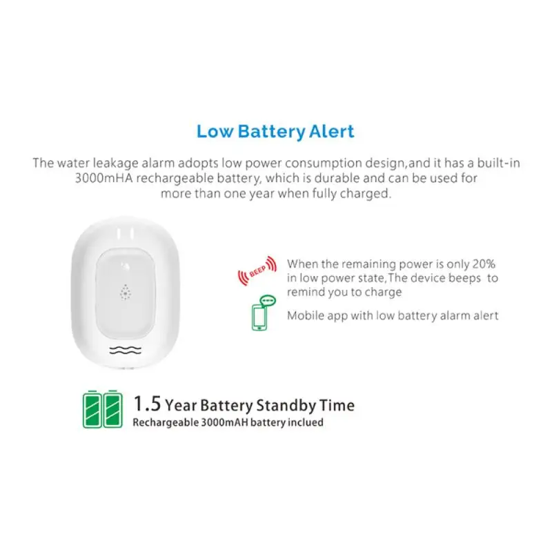 Этот сигнал обнаружения воды может похвастаться громким и мощным сигналом 90 дБ, который будет звучать мгновенно, если вода мостов между устройствами два контакта, а также генерировать оповещения тревоги в вашем мобильном приложении.