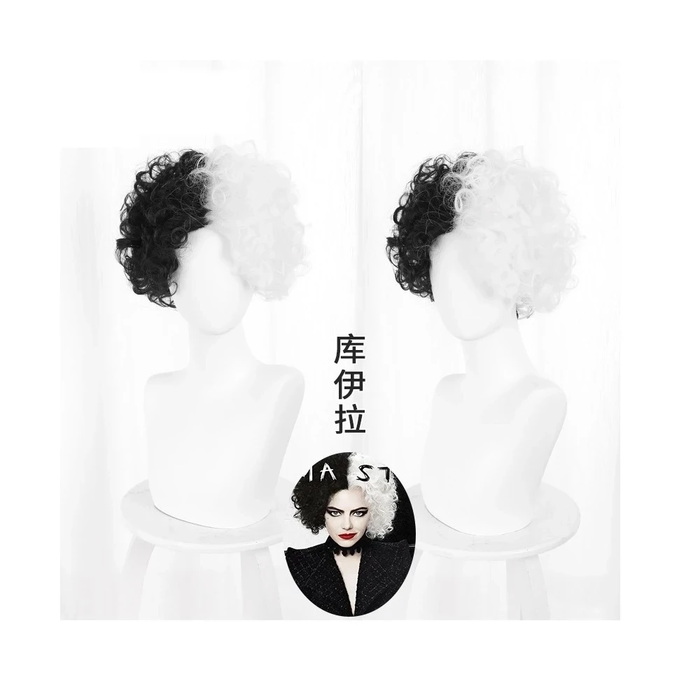 Аниме парики Ведьма Круэлла де Виль Косплей Короткий черно-белый па...