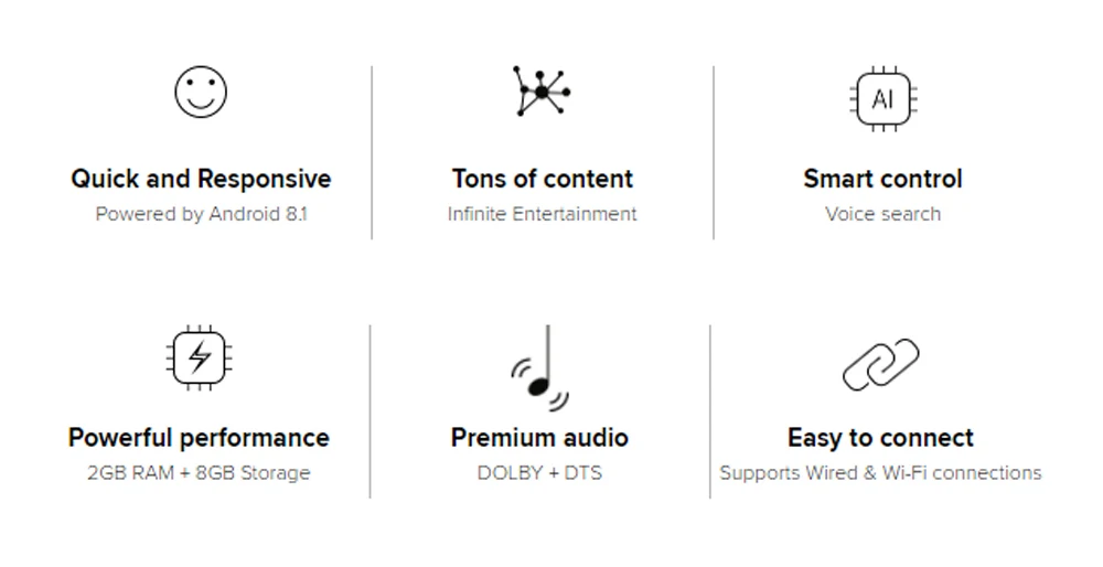 Android 8,1 с глобальными языками, Wi-Fi 802.11a / b / g / n / ac, Bluetooth 4,2, HDMI2.0a
